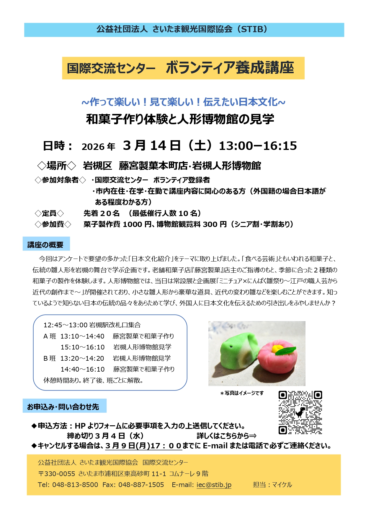 今回はアンケートで要望の多かった「日本文化紹介」をテーマに取り上げました。「食べる芸術」ともいわれる和菓子と、伝統の雛人形を岩槻の舞台で学ぶ企画です。老舗和菓子店『藤宮製菓』店主のご指導のもと、季節に合った2種類の和菓子の製作を体験します。人形博物館では、当日は常設展と企画展「ミニチュア×にんぱく雛祭り~江戸の職人芸から近代の創作まで~」が開催されており、小さな雛人形から豪華な道具、近代の変わり雛などを楽しむことができます。知っているようで知らない日本の伝統の品々をあらためて学び、外国人に日本文化を伝えるための引き出しをふやしませんか?