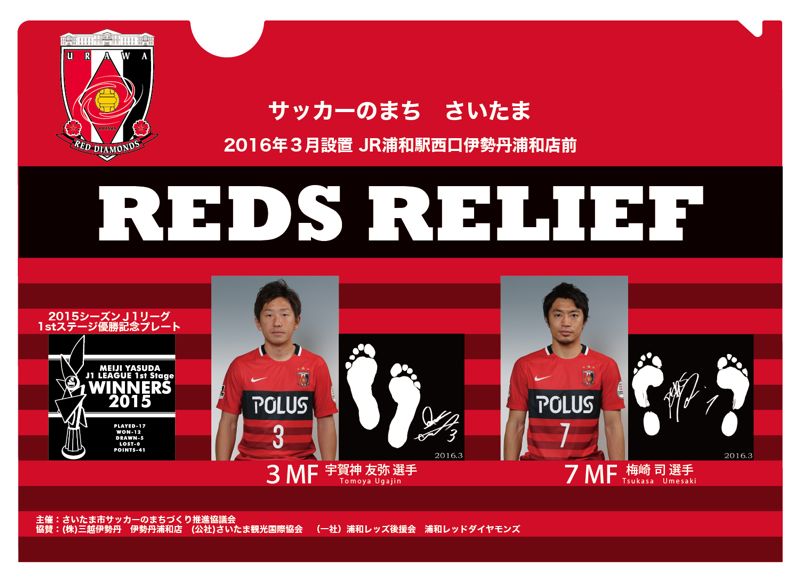 今回は、浦和レッズ在籍150試合以上出場の功績を称えられた「宇賀神友弥 選手」と「梅崎司 選手」のレリーフと共に、「2015シーズン1stステージ優勝記念プレート」が設置されます。