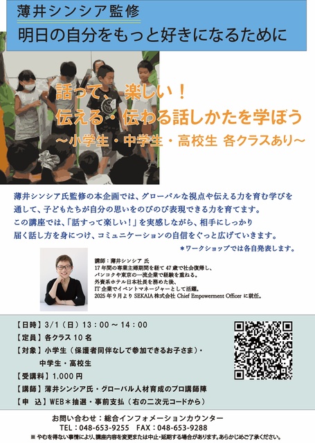 実業家薄井シンシア氏監修企画のプレゼン講座を開催する。プレゼン力・ネットワーキング力・スモールトーキング力を養う講座。ワークショップでは各自発表する。小学生・中学生・高校生の各クラスがある。この機会に、グローバル人材育成のプロたちの講座を体験してみてはいかが?対象は小学生(保護者同伴なしで参加できる子ども)・中学生・高校生。各クラス定員10名。 定員各クラス10名、webにて申込み。